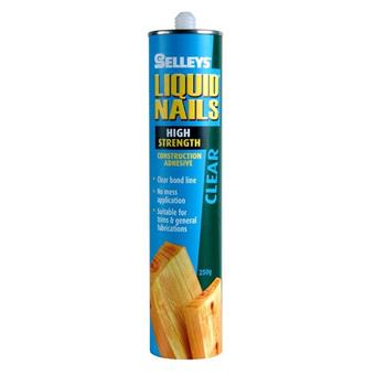 SELLEYS LIQUID NAILS Clear eliminates unsightly mess caused by conventional brown construction adhesives. It dries clear and blends with the surrounding surface, making it ideal where a fine finish is important. Clear bond line – Dries clear and hides imperfect or smudged applications. No mess application – ideal in situations involving multiple joints where the appearance of give can be unsightly. Strong bond to most building substances. UV resistant – does not discolour in sunlight. Suitable for interior & exterior applications |