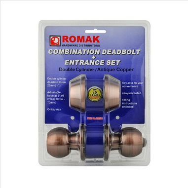 Raymond antique copper finish entrance and deadbolt set is a domestic grade entrance knob set; designed to keep your home safe and secure coupled with keyed alike locks for convenience.