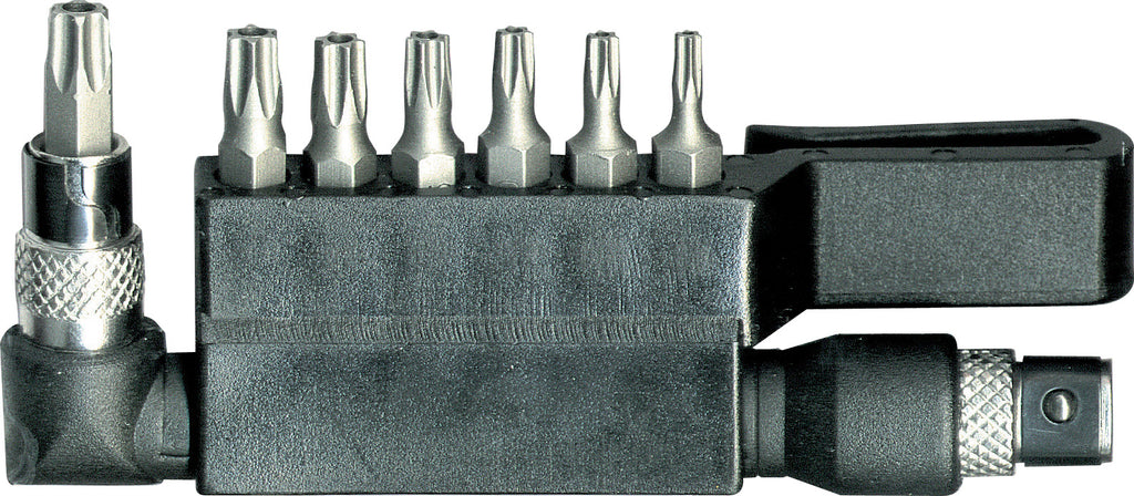 9pce Tamper Proof Bit Set. Hardened steel, contains 7pc screwdriver CRV bits T10, T15, T20, T25, T27, T30, T40, wrench handle & plastic holder
