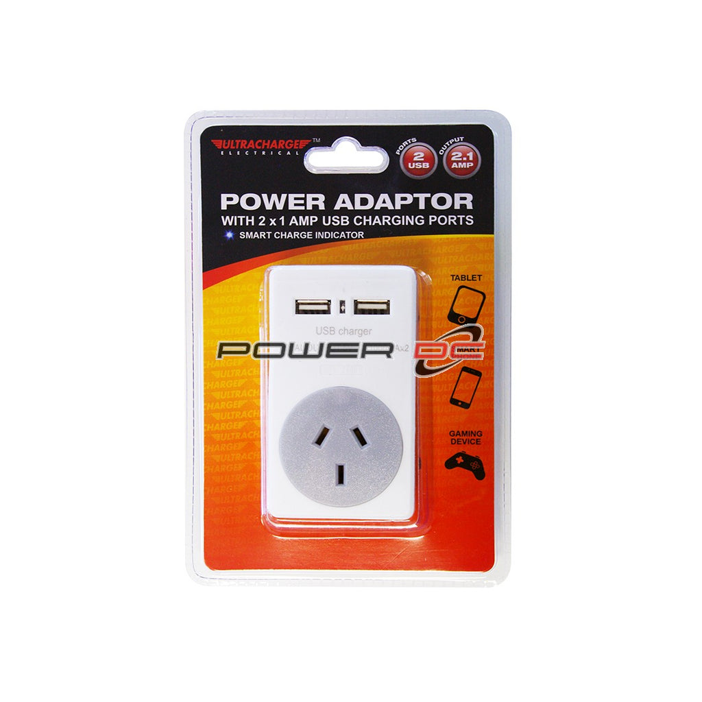 ULTRACHARGE POWER ADAPTOR WITH DUAL USB PORTS - FOR TABLETS, SMART PHONES AND GAMING DEVICES