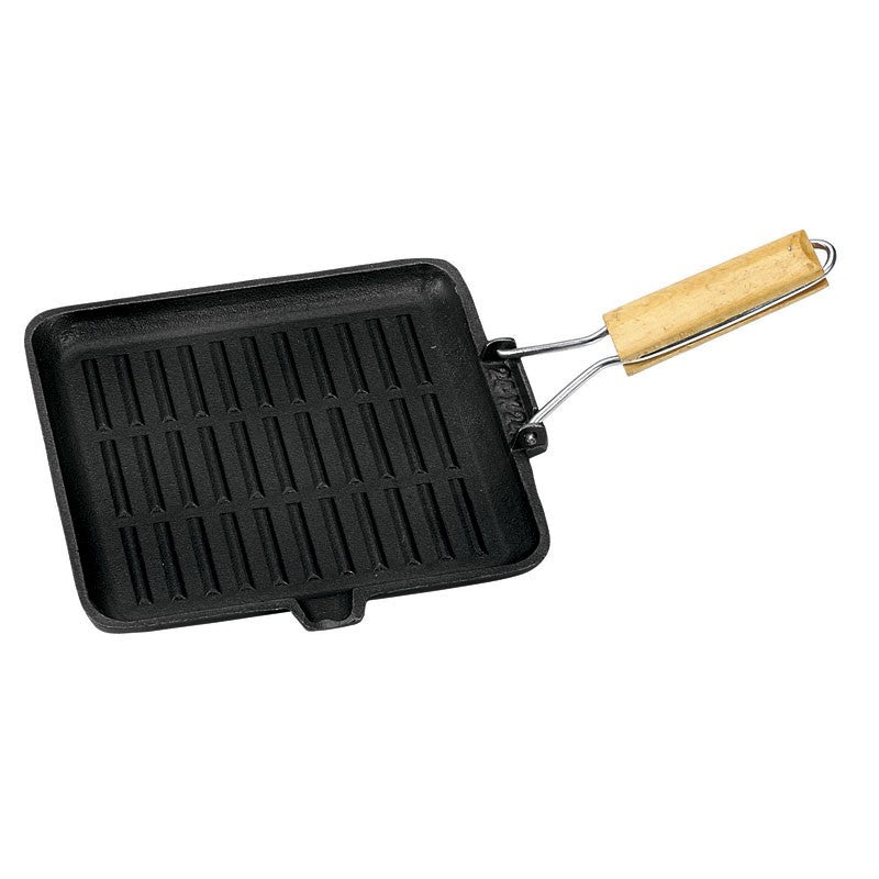 FRY PAN - CAST IRON RECTANGLE GRIDDLE- FOLDING WOOD HANDLE - CAMPFIRE