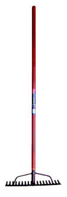 Powder coated carbon steel head with stays, spreading bar for fillings & toppings, long timber handle, tapered socket suitable for raking & spreading leaves, stones & soil.