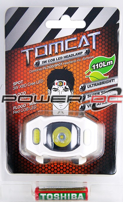 TOMCAT 3W LED/2W COB HEAD LIGHT INC BATTERIES 3W LED Light 3 light modes: Low-High-MAX-OFF 2W COB Light 2 light modes: RED-White-OFF Material: ABS Size: 113*75*38mm Weight: 84g Battery: 2*AAA (included) Brightness: MAX 110LM With velcro strip on back