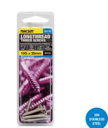 SELF TAPPERS - LONGTHREAD - 10g x 30mm - COUNTERSUNK - STAINLESS STEEL 304 - 6 PCS
